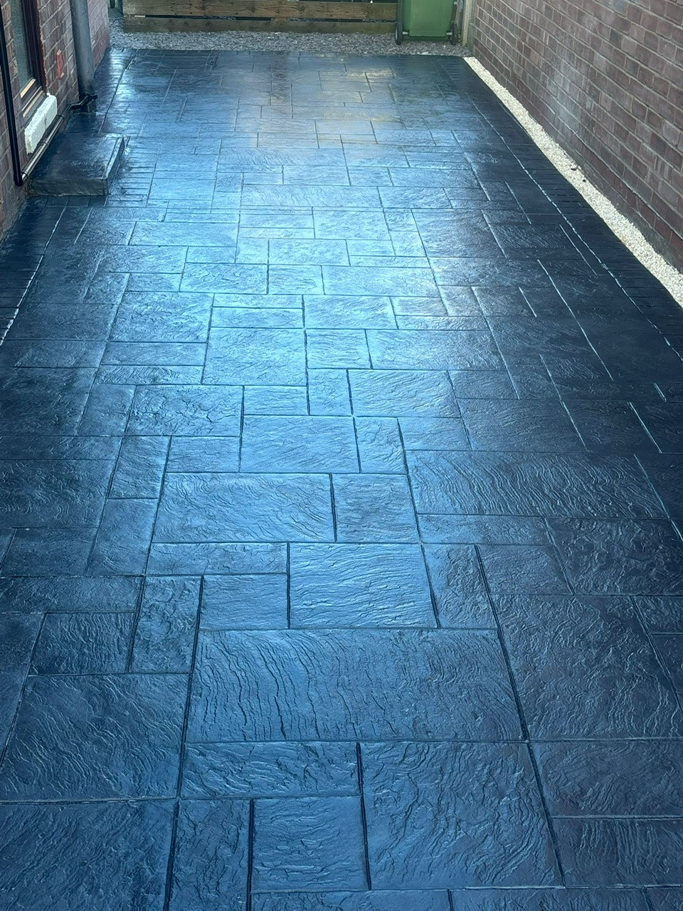 We added a step at the front and the side door which was covered in the same colour and pattern so that it all matched and included a recessed manhole. The pattern imprinted concrete driveway in Urmston, Manchester was then sealed in a mid-sheen acrylic seal with anti-slip agent. You can see what it looks like now completed from the photographs attached.